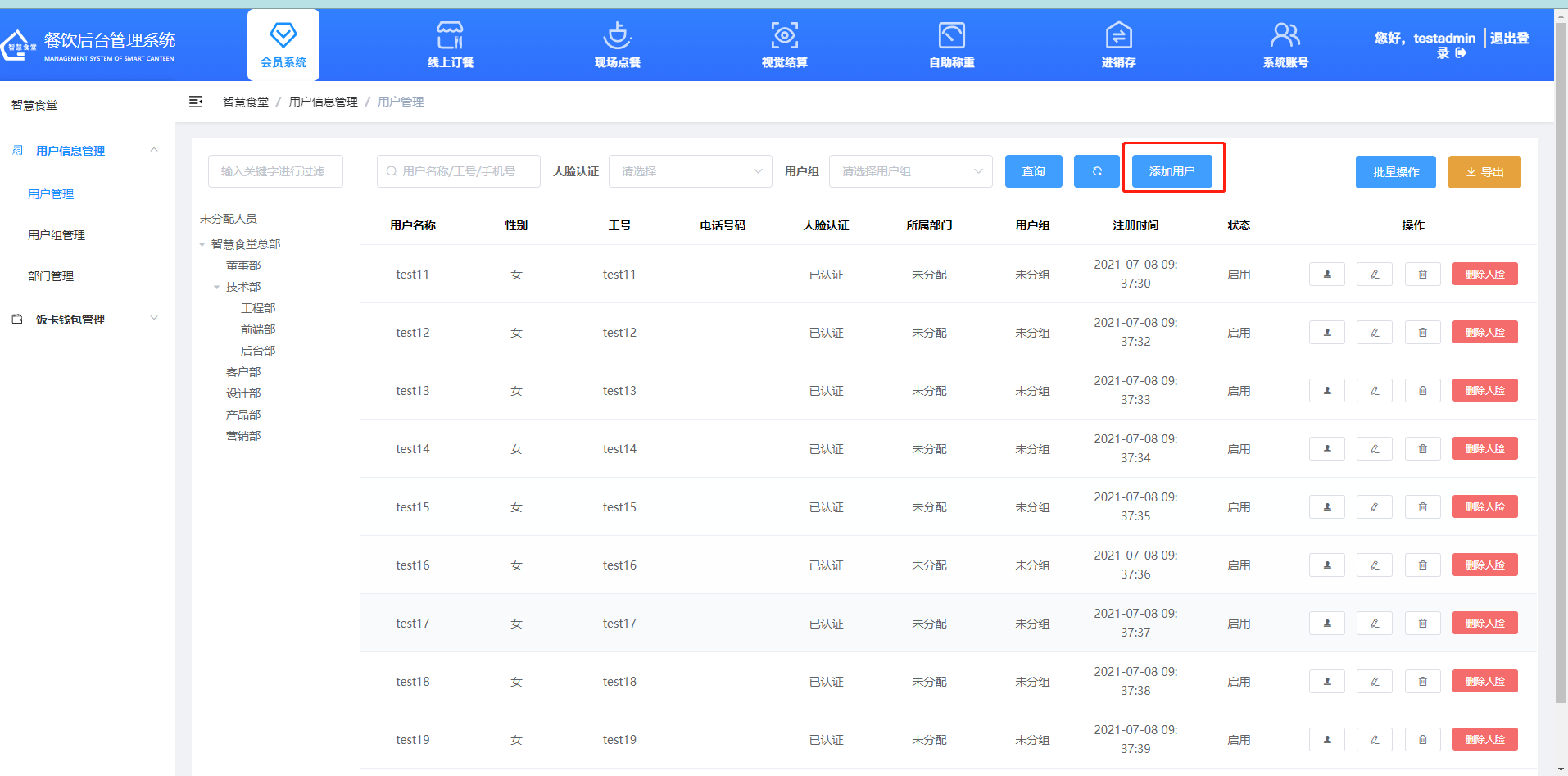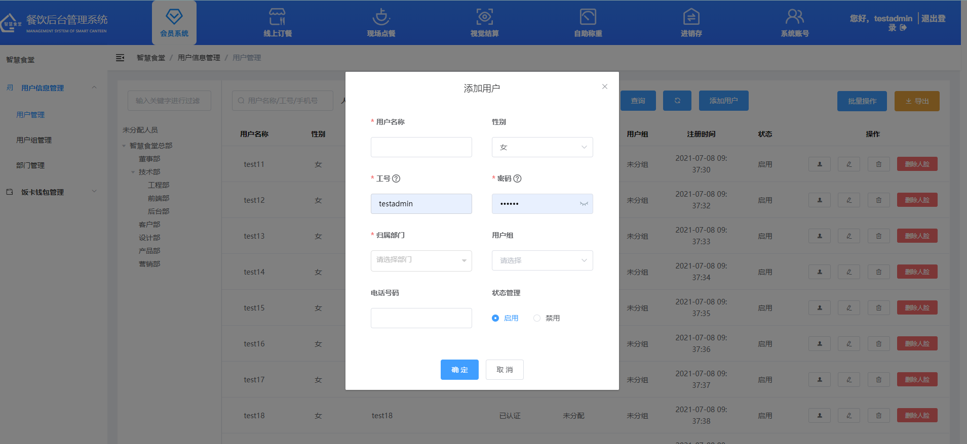 ①點(diǎn)擊“添加用戶”卡片,彈窗添加用戶名稱、工號(hào)、電話號(hào)碼、性別、歸屬部門、用戶組、密碼信息,可設(shè)置用戶狀態(tài)啟用或禁用,當(dāng)設(shè)置啟用是正常使用,設(shè)置禁用時(shí)用戶無法進(jìn)行登陸,可批量用戶導(dǎo)入;