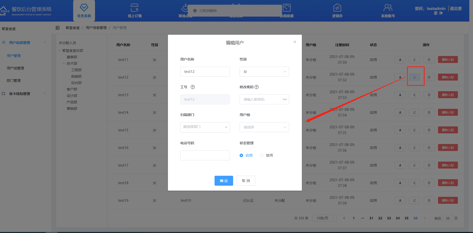 ⑤點(diǎn)擊右側(cè)操作畫筆小圖標(biāo)進(jìn)行用戶編輯,可以修改用戶名、電話號(hào)碼、性別、歸屬部門、用戶組、密碼、狀態(tài)管理等信息;