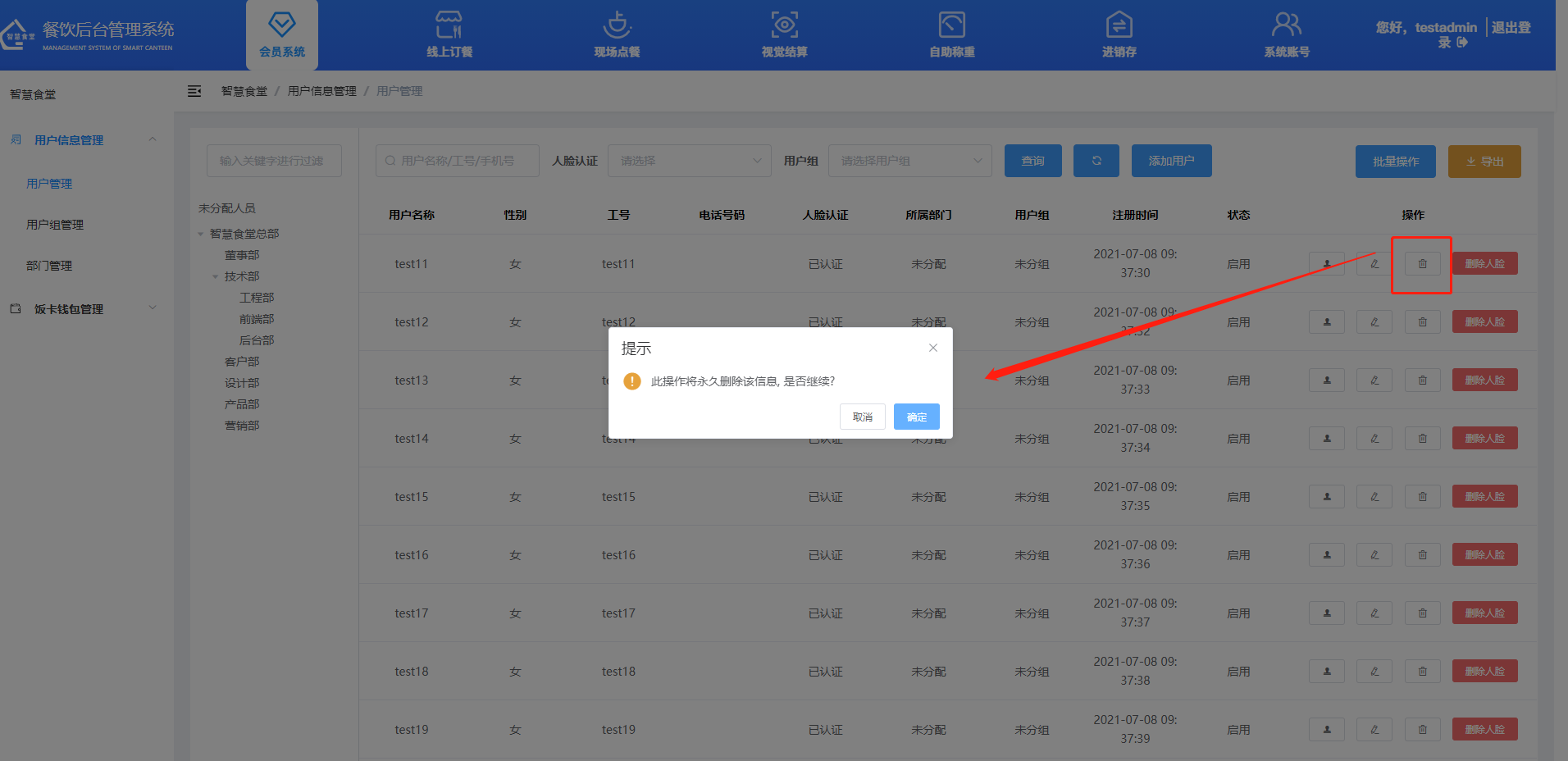⑦點(diǎn)擊右側(cè)人臉刪除按鈕,可以刪除該用戶的人臉信息。