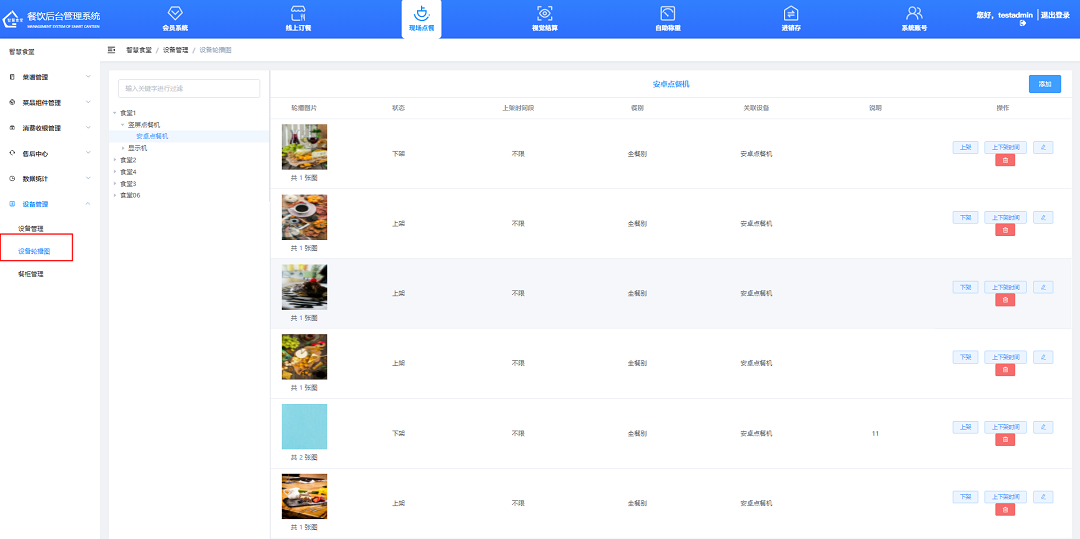 ①點擊“上架”或“下架”按鈕進行上下架操作(上架即設(shè)備展示該輪播圖組,下架即隱藏),可設(shè)置上下架時間及可顯示餐別。
