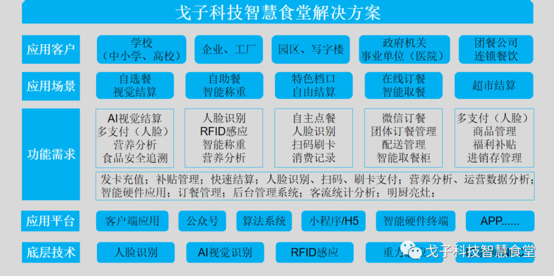 戈子科技結(jié)合高校、中小學(xué)等食堂實(shí)際運(yùn)營場(chǎng)景以及學(xué)校、家長(zhǎng)、師生各方的實(shí)際需求,在整體智慧食堂解決方案背景下,打造了專注于學(xué)校智慧食堂場(chǎng)景的解決方案。