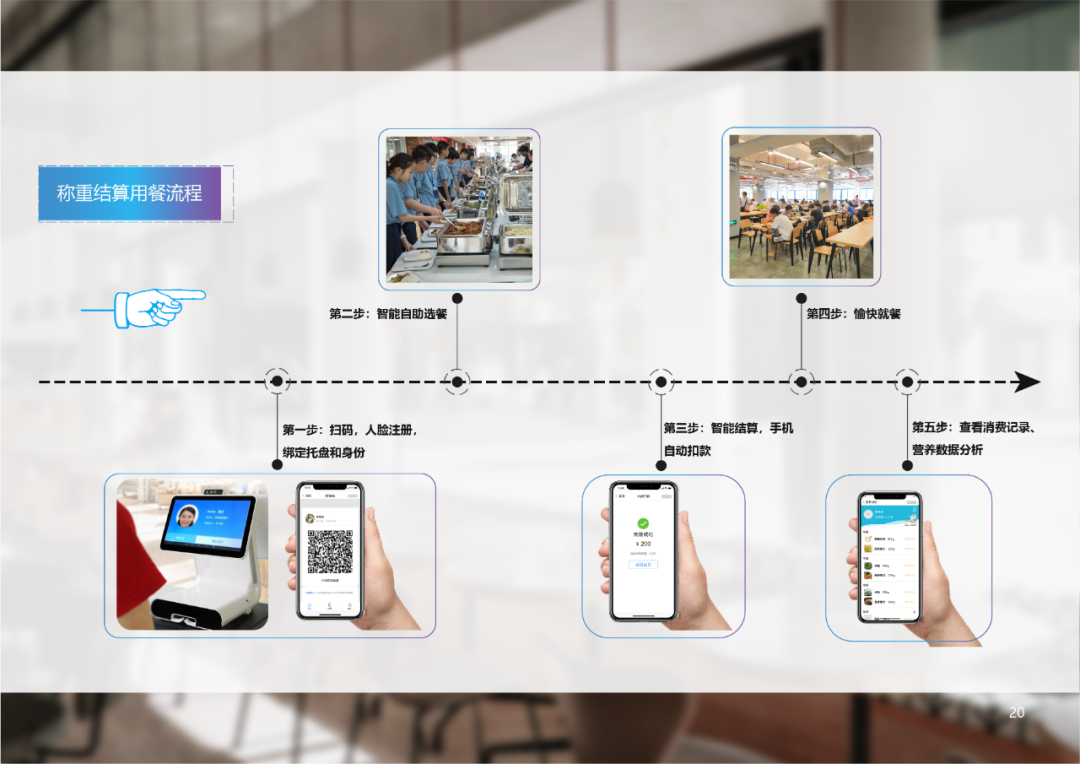 就餐者可以使用微信掃描智能秤上的二維碼即可綁定托盤(pán),以輕松實(shí)現(xiàn)自助就餐。就餐者還可以查看消費(fèi)賬單、營(yíng)養(yǎng)報(bào)告、交易記錄等功能操作;人臉綁定,無(wú)需排隊(duì);自助售賣(mài),改善用餐體驗(yàn),吃多吃少我做主,提升用餐滿意度;餐后查收膳食報(bào)告,均衡營(yíng)養(yǎng)攝入。