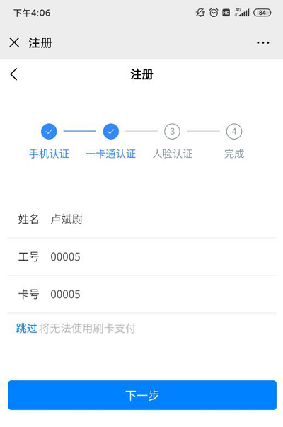 ①輸入姓名、工號(hào)、卡號(hào),點(diǎn)擊“下一步按鈕”,進(jìn)入人臉綁定頁面