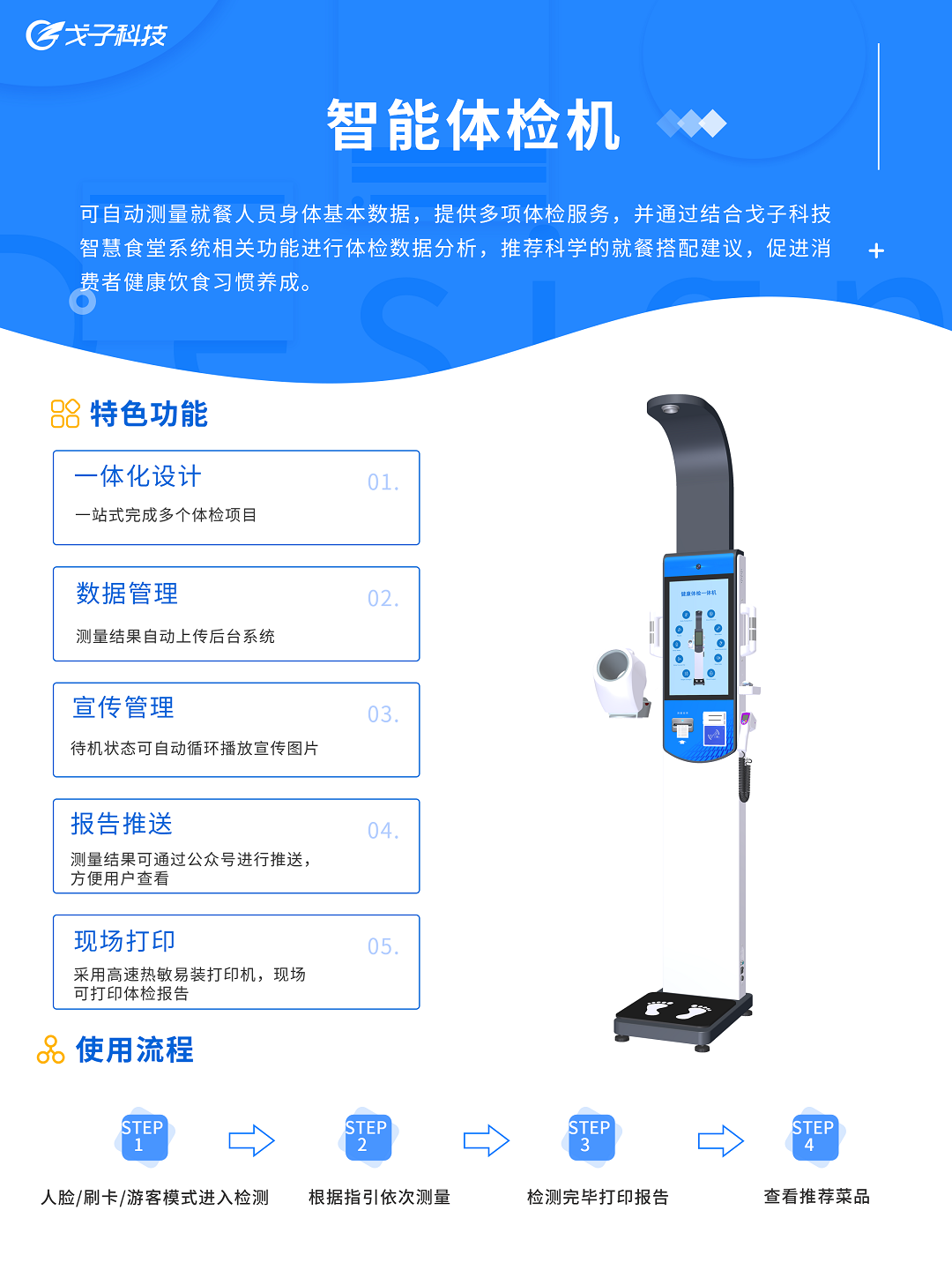 可自動(dòng)測量就餐人員身體基本數(shù)據(jù),提供多項(xiàng)體檢服務(wù),并通過結(jié)合戈子科技智慧食堂系統(tǒng)相關(guān)功能進(jìn)行體檢數(shù)據(jù)分析,推薦科學(xué)的就餐搭配建議,促進(jìn)消費(fèi)者健康飲食習(xí)慣養(yǎng)成。