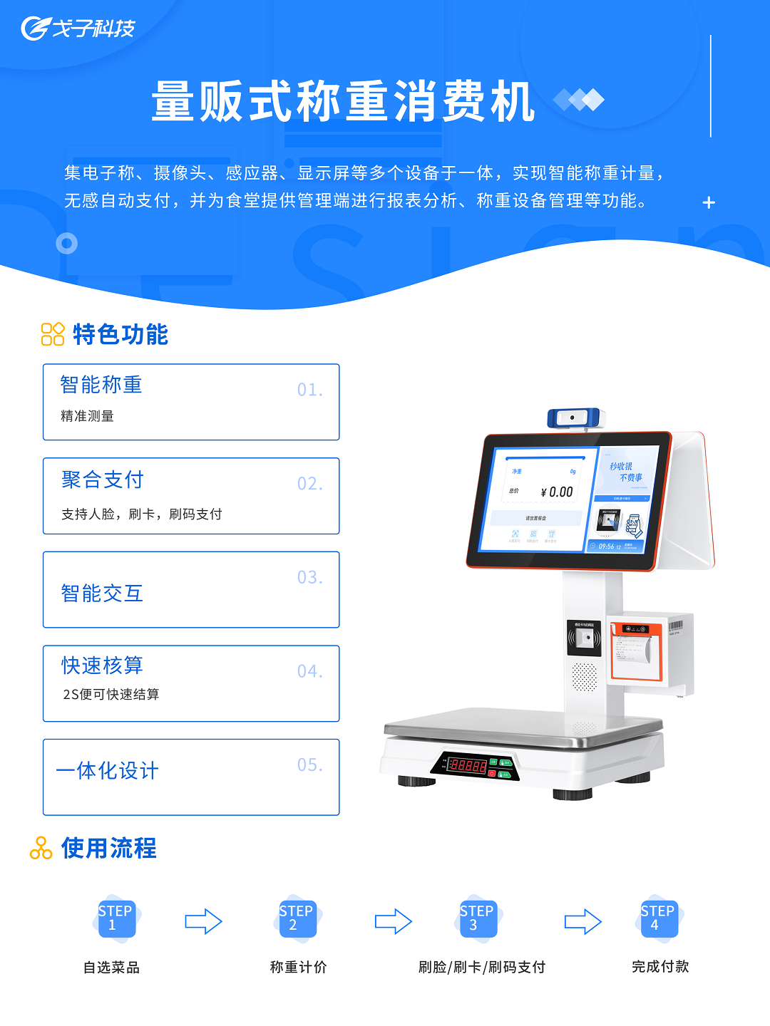 量販?zhǔn)椒Q重消費(fèi)機(jī)集電子稱、攝像頭、感應(yīng)器、顯示屏等多個(gè)設(shè)備于一體,實(shí)現(xiàn)智能稱重計(jì)量,無感自動支付,并通過顯示菜品的營養(yǎng)成分和消費(fèi)記錄推薦提醒,并為食堂提供管理端進(jìn)行報(bào)表分析、稱重設(shè)備管理等平臺,引導(dǎo)就餐者適量取餐,科學(xué)用餐。