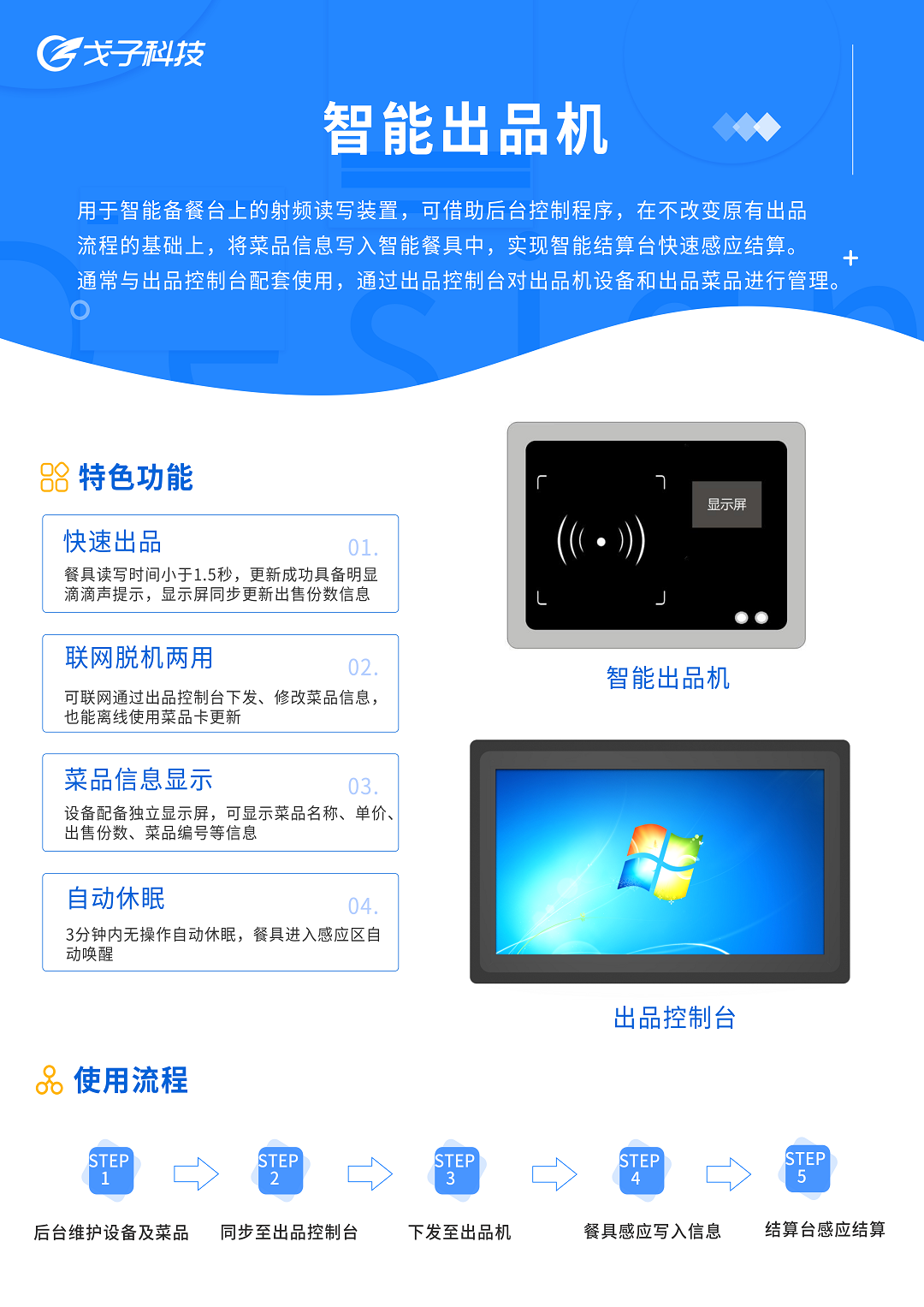 戈子科技智能出品機(嵌入式)是嵌入在智能備餐臺上的射頻讀寫裝置,可借助后臺控制程序,在不改變原有出品流程的基礎(chǔ)上,將菜品信息寫入智能餐具中,以實現(xiàn)智能結(jié)算臺通過芯片感應(yīng)寫入的菜品信息進行快速結(jié)算。通過智能出品管控系統(tǒng),可以統(tǒng)一餐盤顏色,減少餐盤分類分揀,減少后廚人員清洗工作量。